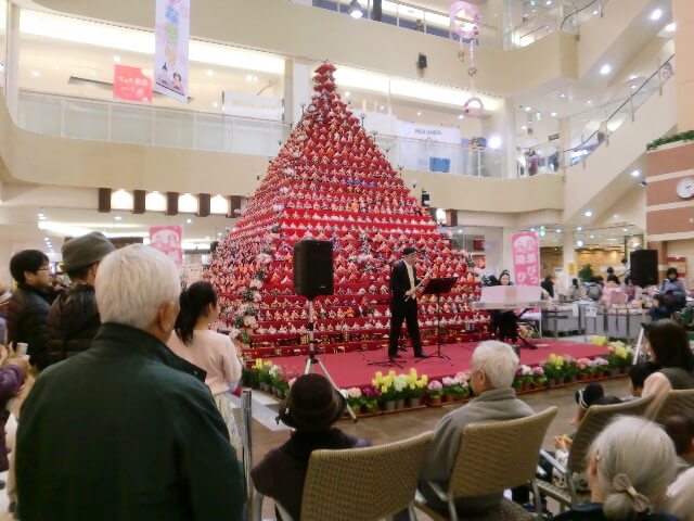 会場では、エレクトーンとフルートのコンサートやゲストをお迎えしてのコンサートも開催されており、賑わっていました。数え切れない程のお雛様は華やかで春の花も飾られており、外はまだ寒かったですが春を少し先取りし、にこやかに鑑賞する事が出来ました。やはり女の子のお祭りですね。