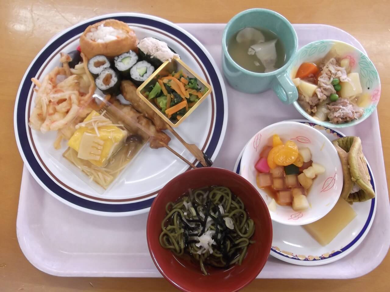 5月2日にりんごの家にてお楽しみバイキングを実施しました。今年のテーマは"和"です。焼き鳥や茶わん蒸し、いなり寿司など合計10品以上の食事が出ました。デザートにはワッフルや羊羹も食べ、普段より少々豪華な食事に、利用者の皆様の笑顔がたくさん見られました。当日は天気も良く、食堂以外に中庭のウッドデッキ等外のスペースでも食事を楽しむことが出来ました。普段と食事の場所が違うだけでも、特別に楽しい気持ちになる様でした。最後になりますが、ご来園いただいたご家族の皆様ありがとうございました。また行事開催の際にはたくさんのご参加お待ちしています。