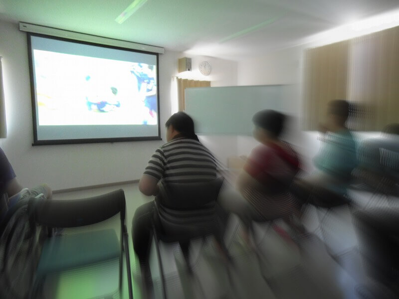 本日は日本のワールドカップ初戦。職員や利用者の皆さんと管理棟2階多目的室の100インチスクリーンにて観戦しました。