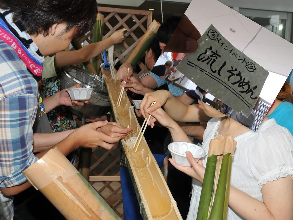 8月9日(土)、台風11号が日本列島を縦断している中、納涼祭を行いました。。台風の影響もあり、盆踊りは中止させていただきましたが、メインイベントの流しそうめんをも車寄せの屋根がある場所で行う事ができました。数日前より職員により竹の細工、実際にそうめんが流れるかチェックを行い準備を整え、皆さん楽しそうに参加していただくことができました。
