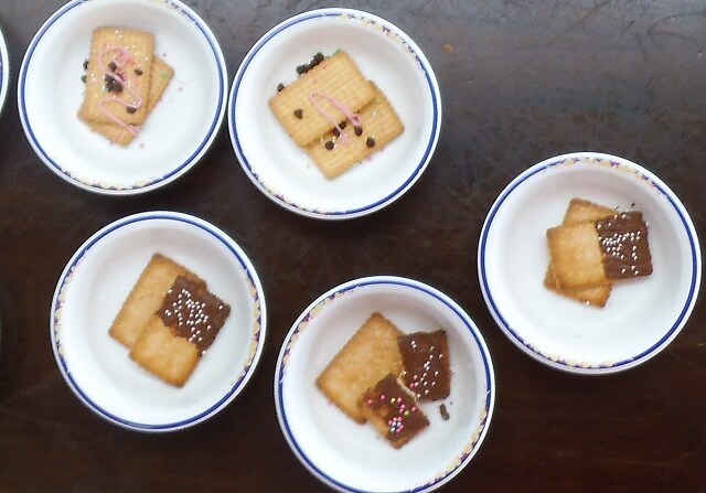 6月30日のおやつの時間に、お菓子の家を作りました♪ビスケットを溶かしたチョコレートでくっつけながら、組み立て、カラースプレーやデコペンでかわいく飾り付け☆